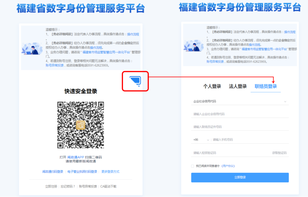 第三步:進入“福建省數(shù)字身份管理服務平臺”登錄頁面,可選擇聯(lián)絡員掃碼登錄、電子營業(yè)執(zhí)照掃碼登錄、CA登錄等方式,或點擊二維碼右上方的小電腦圖標,切換至聯(lián)絡員信息登錄,在“企業(yè)社會信用代碼”欄內(nèi)填寫統(tǒng)一社會信用代碼,在“聯(lián)絡員證件號碼”欄內(nèi)輸入聯(lián)絡員身份證號碼,在“手機號碼”欄內(nèi)輸入聯(lián)絡員手機號碼,然后點擊“獲取驗證碼”,收到驗證碼后輸入,點擊“立即登錄”。