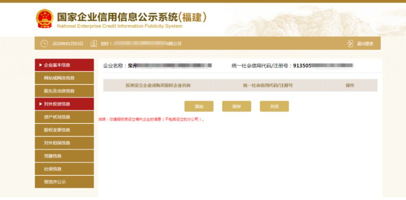 點擊頁面下方的“添加”按鈕,彈出添加股權(quán)變更信息頁面,填寫相應的信息,點擊“保存”按鈕,即可成功添加股權(quán)變更信息。如填寫信息需要修改,點擊“修改”,彈出修改頁面,修改相關(guān)信息。然后點擊“保存”按鈕,修改成功。最后再點擊“保存”按鈕,進入下一部分內(nèi)容的填寫頁面。 第九步:填寫對外投資信息。點擊左邊的“對外投資信息”,之后再根據(jù)實際情況點擊“添加”填寫相關(guān)信息,填寫完成后點擊“保存”。如無對外投資情況的則無需填寫此項信息。