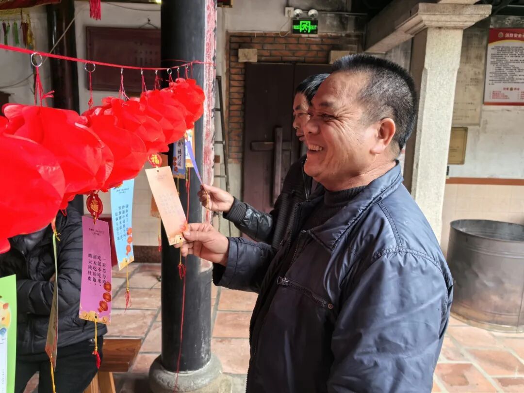 活動(dòng)現(xiàn)場(chǎng)張燈結(jié)彩,紅彤彤的燈籠高高掛起,一條條涵蓋軍史常識(shí)、國(guó)防知識(shí)、民俗文化、字謎成語(yǔ)的燈謎彩條隨風(fēng)飄揚(yáng),兼具趣味性與“軍味”。祖厝內(nèi)暖意融融,退役老兵們?cè)缭鐏?lái)到現(xiàn)場(chǎng),或駐足凝神思索,或三五成群熱烈討論,不時(shí)互相提示、分享解題思路。猜中謎底的老兵們喜笑顏開(kāi),現(xiàn)場(chǎng)歡聲笑語(yǔ)不斷,熱鬧而融洽,處處洋溢著濃厚的節(jié)日氛圍。